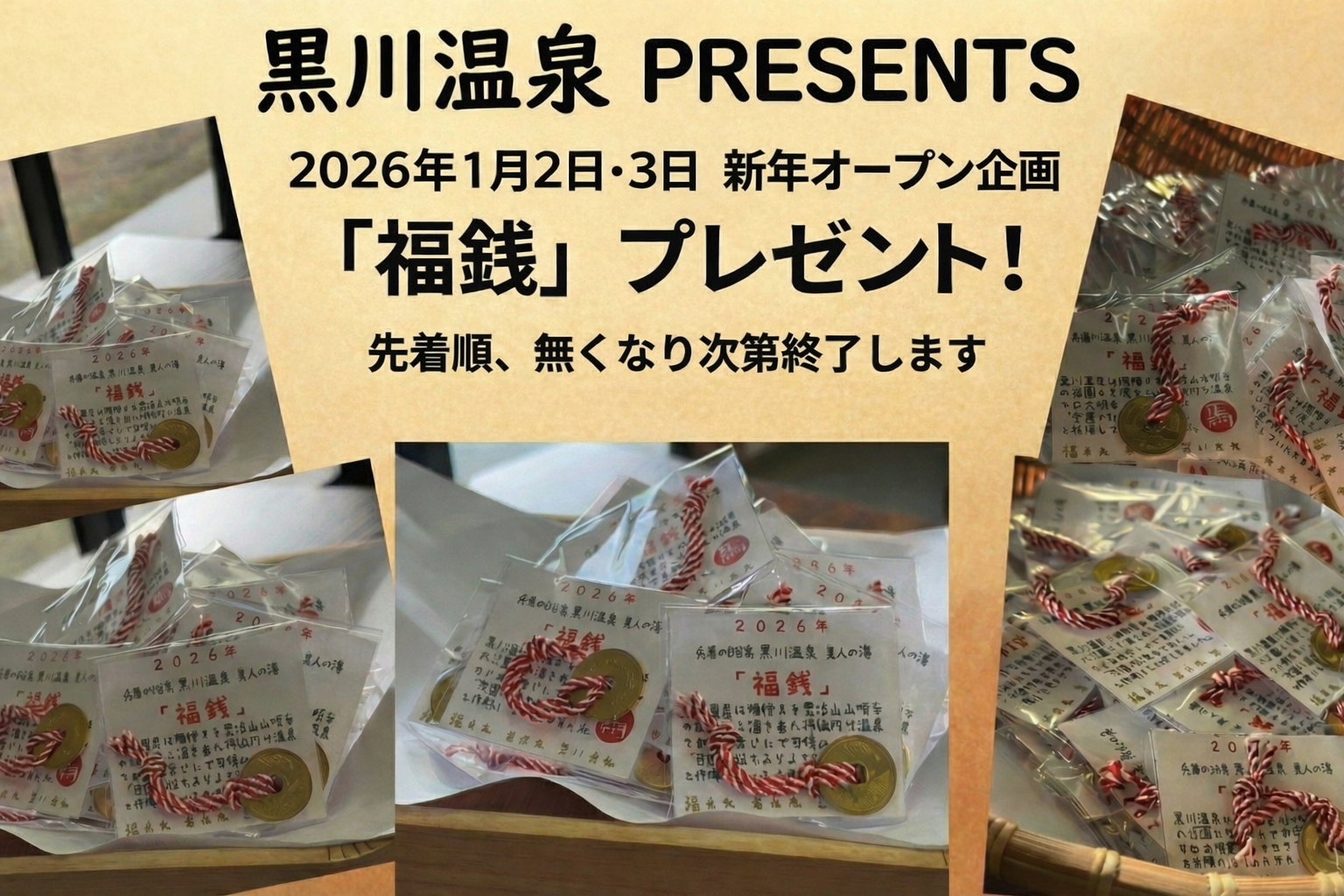 新年を迎えるにあたり、黒川温泉 – 兵庫の秘湯 美人の湯では、2026年1月2日・3日の2日間限定で「大明寺祈祷 福銭プレゼント」を実施いたします!