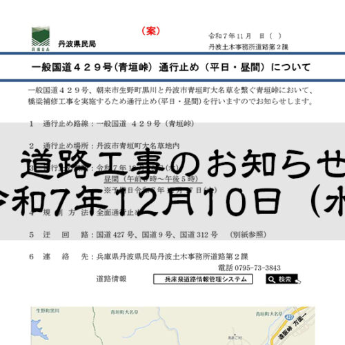 国道429号 丹波市青垣町 大名草(青垣峠)道路防災工事のお知らせ